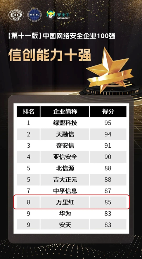 ??12月1日,第十一版《中國網(wǎng)絡(luò)安全企業(yè)100強》正式發(fā)布,東方科儀控股集團有限公司(以下簡稱“東方科儀控股”)旗下企業(yè)北京萬里紅科技有限公司(以下簡稱“萬里紅”)憑借出色的經(jīng)營能力、技術(shù)創(chuàng)新、信創(chuàng)能力以及廣泛的行業(yè)應(yīng)用從300余家安全廠商(服務(wù)商)中脫穎而出,榮膺《中國網(wǎng)絡(luò)安全企業(yè)100強》榜單第10名,位列“技術(shù)創(chuàng)新十強”第10名、“信創(chuàng)能力十強”第8名。