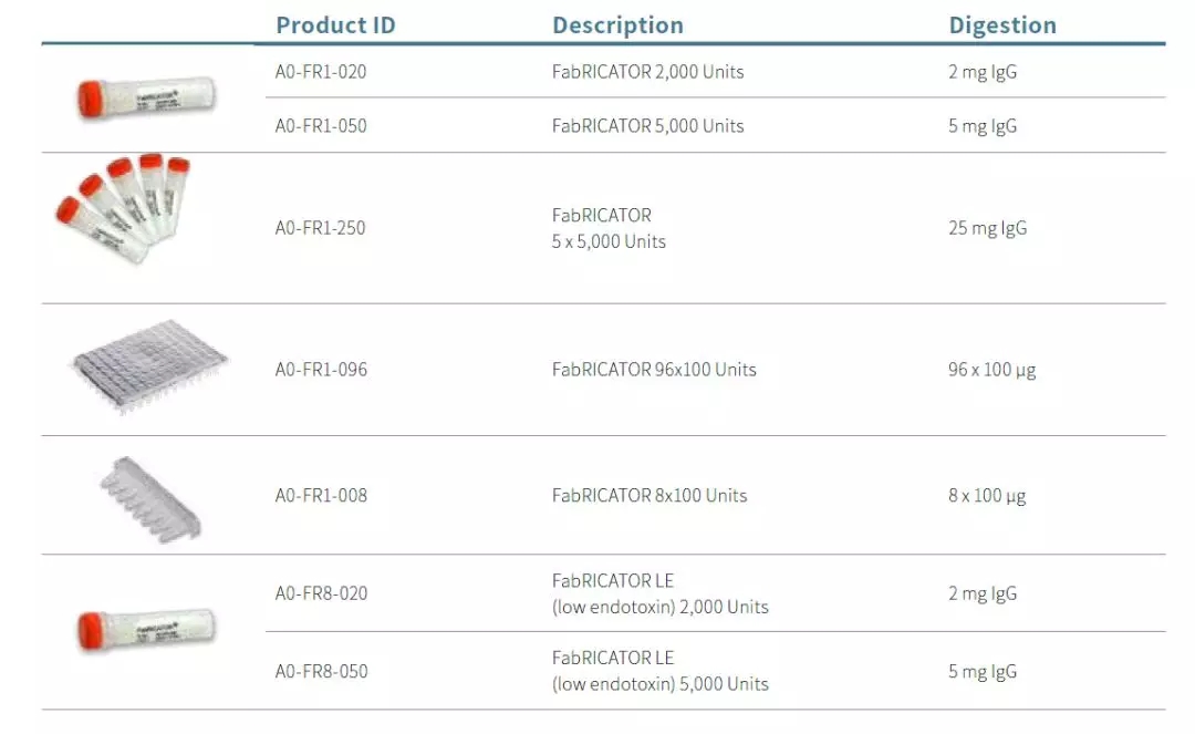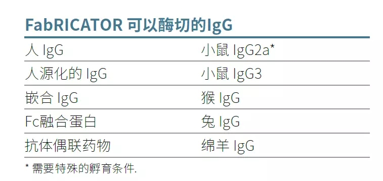FabRICATOR? (IdeS)is a unique cysteine protease that cleaves IgG at a single amino acid site below the hinge region. The digestion reaction can be completed in only 30 minutes, and no condition optimization is required.