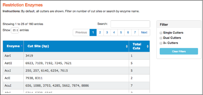 Here you'll find a table of restriction enzymes that cut the given sequence. The table includes enzyme names, the locations where the enzymes will cut (in basepairs), and the total number of times they cut. Use the filters on the right to find single, dual, and 3+ cutters. You can also sort enzymes by clicking on column heads. Clicking on a particular restriction enzyme here also highlights it in the “Map” and “Sequence” tabs.。