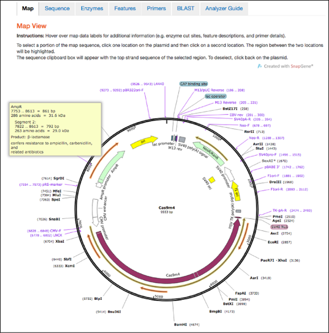 This is the first tab you’ll land on after clicking the “Analyze Sequence” button. The maps hosted here retain all the features shown in the static maps discussed above, but also have interactive functionalities. You can now hover over any feature, enzyme, primer, or ORF to learn more information about it. For example, if you hover over the ampicillin resistance gene, you’ll find the full name of the gene, the name of its gene product, and a description of its function. You can also click one location in the plasmid and then a second location to select the sequence between the two locations and send it to the clipboard for copy and paste functionality.