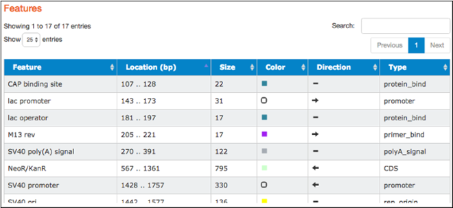 The table found here lists the common features detected in the plasmid sequence. The table includes feature names, locations, sizes, colors used to indicate them on the map, direction (if relevant), and types. Types listed are standard GenBank feature types. Clicking on a particular feature here also highlights that feature in the “Map” and “Sequence” tabs.