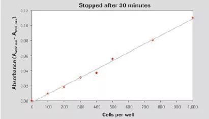 圖1. Cytotoxicity Detection KitPLUS (LDH)具有良好的線性;圖為使用該試劑盒測定不同數目U-937細胞培養基中總LDH活性,底物孵育5min后進行檢測。