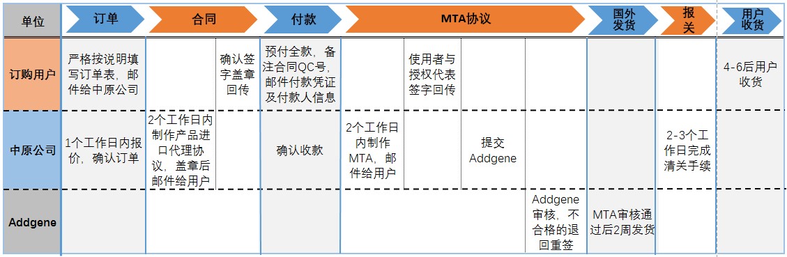 訂購流程:填寫訂單表→生成協(xié)議→回傳協(xié)議并付款→簽署MTA→4周左右到貨(詳見以下Addgene產(chǎn)品訂購須知)