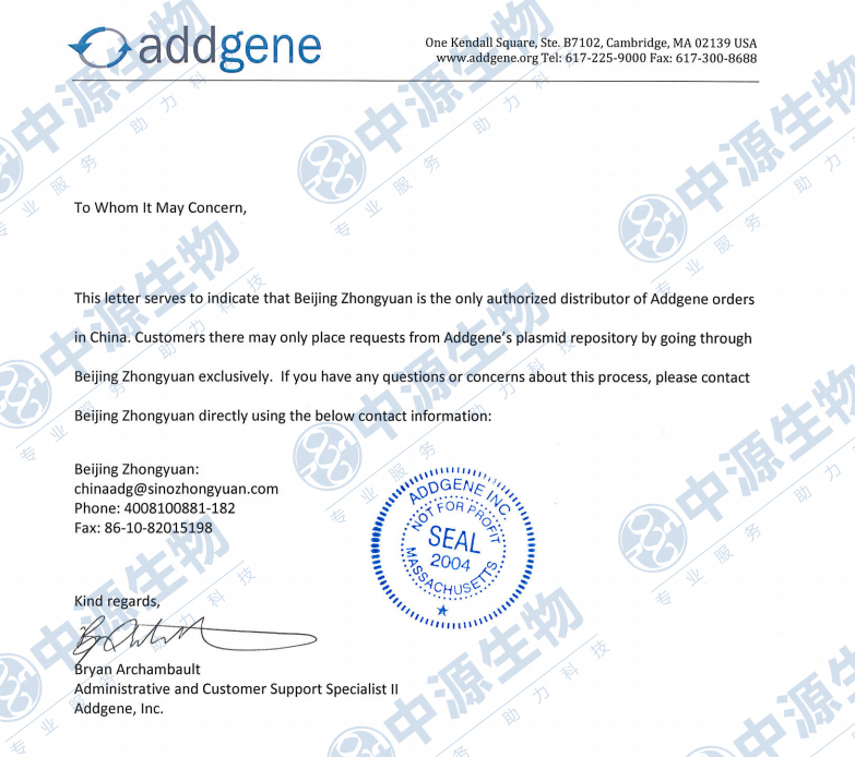 Addgene指定北京中源合聚生物科技有限公司為其中國大陸獨家授權(quán)代理商,授權(quán)可在Addgene官方網(wǎng)站 https://www.addgene.org/ordering/international/ 上查詢確認。