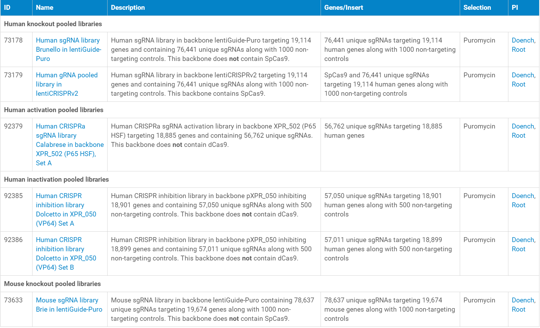 以下是目前可以提供的CRISPR libraries研究相關慢病毒對應的質粒,點擊“Name”列即可進入質粒對應的慢病毒產品頁面,從而可以查詢慢病毒產品的價格、體積、滴度、運輸形式、儲存溫度等信息。