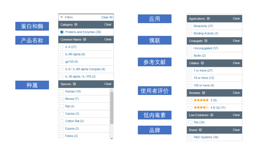 點擊「Proteins and Enzymes」,進入到如下頁面,可以看到有 39 個產品,下圖對 Filters 中的每一欄也作出中文解析,這里重點介紹一下 Applications 中的 Bioactivity 和 Binding activity 的含義: