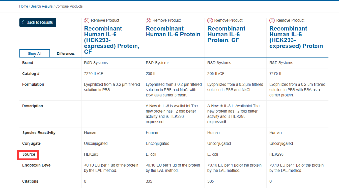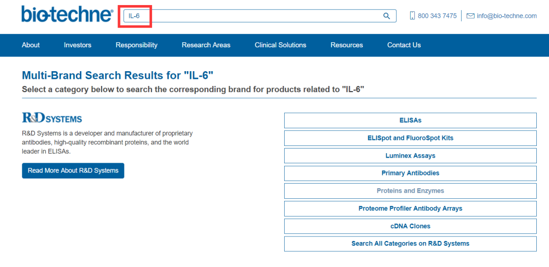 此時,Bio-Techne 旗下 R&D Systems?,Novus Biologicals?,Tocris?,ProteinSimple? 都列出了包含 IL-6 的所有產品類型(下圖僅列出了 R&D Systems? 品牌的相關產品)。