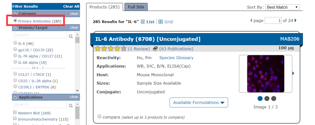 根據上述蛋白的選擇方法,首先選擇正確的產品名稱 Protein/target,發現不僅有 IL-6,還出現了 gp130/CD130、IL-7R alpha/CD127 和 IL-6R alpha。這是因為 IL-6 是一種多效性細胞因子,通過與配體特異性的 IL-6 受體(IL-6R)和共同的信號轉導受體(gp130)組成的受體系統發揮生物學功能,所以也會搜索出和 IL-6 相關的抗體。