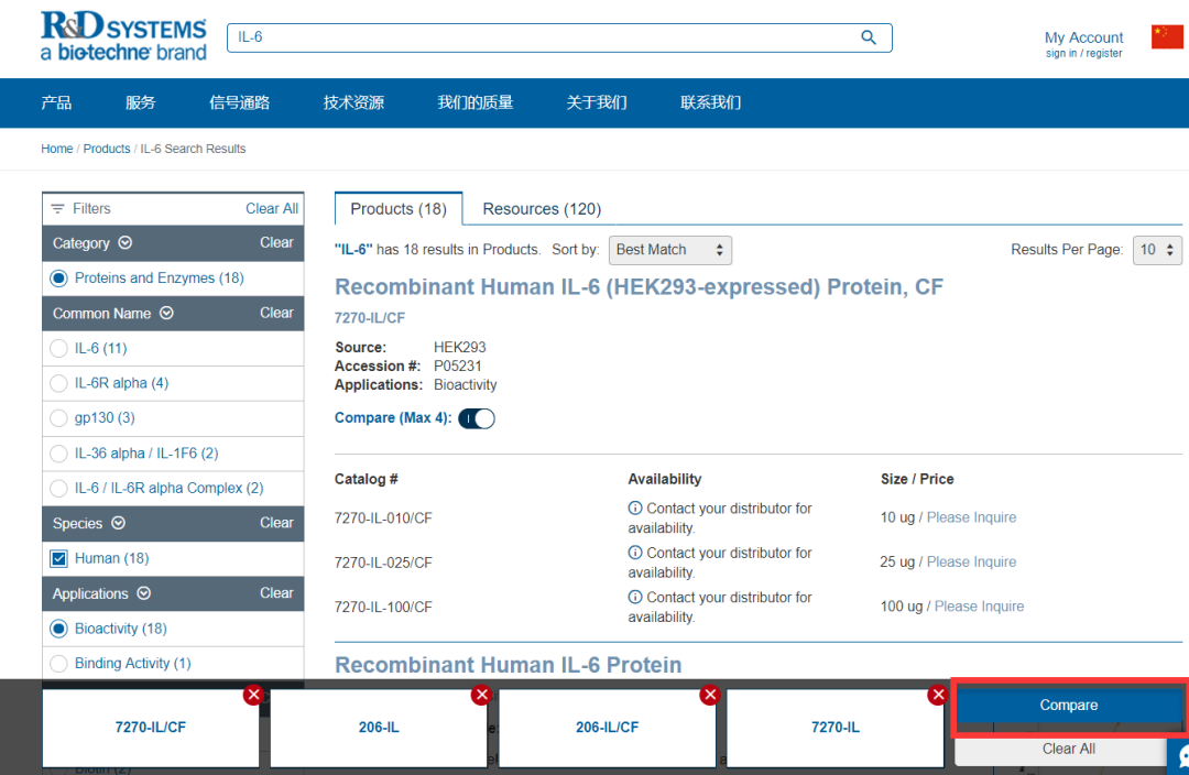 這里也告訴大家 R&D Systems?對比產品的獨門秘籍:「Compare」功能,最多可以選擇 4 個產品,我們以頁面上的前 4 個產品為例,選取之后,點擊右下角的「Compare」,