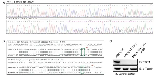 圖2. STAT1-KO-MDCK 細胞特征。(A)MDCK.STAT1KO 細胞 STAT1 基因測序結果證實STAT1基因斷裂。(B)測序結果顯示,MDCK.STAT1KO 細胞是一個雜合子。一條等位基因存在單一堿基插入,另一個等位基因存在4堿基的缺失。(C)WB結果顯示,無論是低代次還是高代次, MDCK.STAT1KO 細胞都沒有 STAT1  蛋白表達。