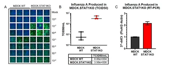 圖1. 甲型流感(H1N1;ATCC?VR-1736?) 接種 STAT1-KO-MDCK 細胞實驗結果。(A)MDCK WT 親本和 MDCK.STAT1 型 KO 細胞,接種甲型流感,48小時后收集細胞上清液。綠色-抗流感病毒染色,藍色-核染色。(B)感染甲型流感病毒48小時后細胞上清液的TCID50值。(C) RT-PCR法定量檢測感染48小時后甲型流感病毒基因組拷貝數。