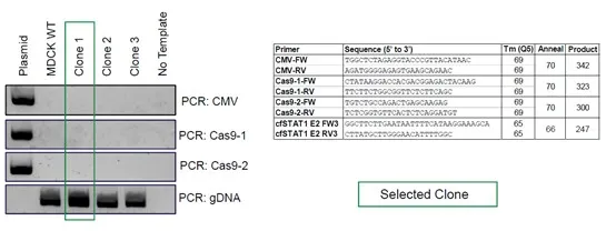 圖3. STAT1-KO-MDCK 細胞無 Cas9/CMV 基因序列的整合。