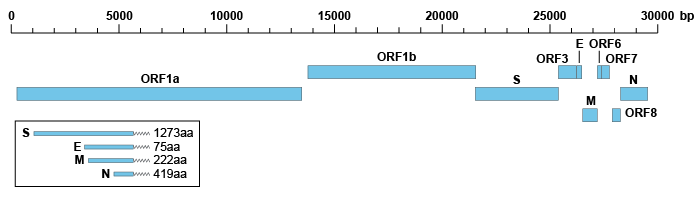 SARS-CoV-2 是一種約 30kb 的陽性單鏈 RNA 病毒,其基因組組成與 SARS-CoV 相似,兩者都是由兩個(gè)主要的開放閱讀框(ORF)和幾個(gè)較小的下游 ORF 組成。