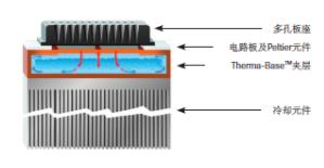 LightCycler480Ⅱ熱循環模塊的橫截面圖。Therma-BaseTM是一個內壁布滿燈芯狀毛細管結構的腔體,以有效增大接觸表面積。通過一系列實時冷凝和蒸發效應,高效傳遞熱量,從而實現整板優秀的溫度均一性。